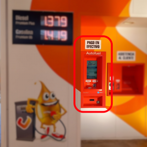 Los cheques de devolución pueden ser canjeados en las máquinas de pago en efectivo (Autofuel). Ubicadas en todas las casetas de nuestras estaciones de servicio tal y como se muestra en la imagen.